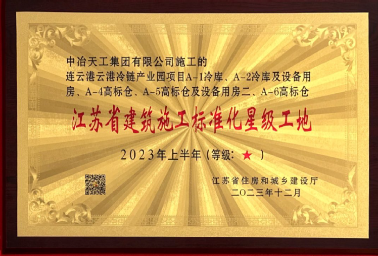2023-127连云港云港冷链产业园项目A-1冷库、A-2冷库及设备用房、A-4高标仓、A-5高标仓及设备用房二、A-6高标仓2023年上半年江苏省建筑施工标准化星级工地(等级:★)牌匾
