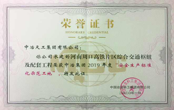 中冶集团2019年度“安全生产标准化示范工地”-河南周口高铁片区综合交通枢纽及配套工程
