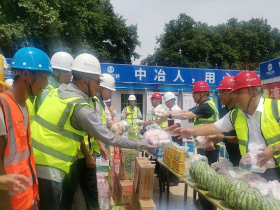 烈日炎炎,酷暑難耐。自入伏來,九江市溫度持續(xù)攀升,堅守一線的施工人員無懼“烤”驗,與烈日較量、與高溫抗衡,在施工現(xiàn)場揮汗如雨、辛勤作業(yè)。為感謝他們在烈日高溫下堅守崗位、為保障項目進度所做出的貢獻,項目將西瓜、飲料、礦泉水、綠豆湯等降溫消暑物品,一一送到一線建設(shè)者中,并關(guān)切詢問他們身體狀況,提醒大家在保證安全生產(chǎn)的同時,要注意身體健康,防止高溫中暑;現(xiàn)場還宣講了高溫防護、中暑自救與互救的相關(guān)知識,叮囑大家在高溫期間一定要合理安排作業(yè)時間,確保安全。