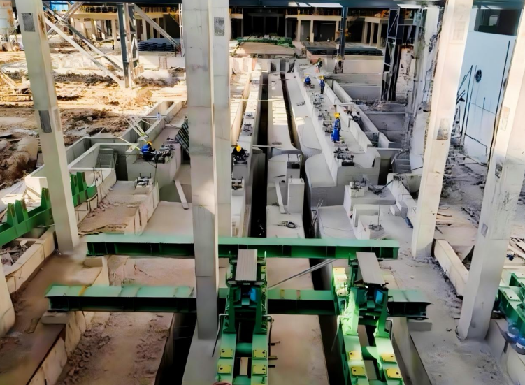 百日攻堅,節點密集突破。3 月底樁基移交后,項目部迅速吹響 “百日奮戰” 號角,集中力量同步推進土建與鋼結構施工,搶抓有利時節實施輪班加班,形成大干快上的濃厚氛圍。近百日的拼搏中,多項關鍵節點按期甚至超前完成。土建方面,3 月 26 日連鑄機基坑開挖,5月15日大包回轉臺及主機基礎澆筑,6月 15 日連鑄電氣室等主體建筑具備安裝條件,6月30 日連鑄機全線基礎及主體建筑全部驗收交安;鋼結構方面,3月25日煉鋼廠房第一根鋼柱吊裝,6月20日煉鋼吊車梁軌道全部安裝完畢,6月30日連鑄區域、LF 爐區域廠房屋面移交彩板封閉完成。