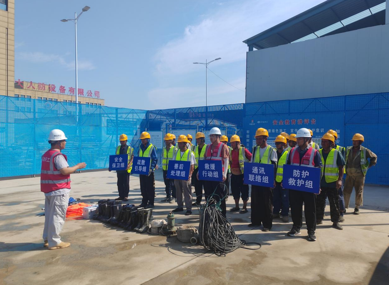 本次演練緊貼實戰場景,演練模擬了強降雨導致工地周邊水位迅速上升的緊急情況。演練前,項目部制定了詳細方案,明確預警發布、人員撤離、應急救援等各環節職責,有效確保了參演人員熟悉流程、精準配合。在接到預警信號后,項目安全負責人立即啟動全流程防汛應急預案,組織施工人員迅速撤離到安全區域。同時,應急小組成員迅速行動,對現場進行沙袋加固,防止洪水侵入工地。應急救援隊伍同步進行了模擬救援,對被困人員快速開展疏散和醫療救助。整個演練過程緊張有序,各小組配合默契,所有參演人員都嚴格按照預案要求完成了各項操作,確保了演練的實效性,充分展示了項目部應對突發洪水災害的快速反應能力和協同作戰能力。