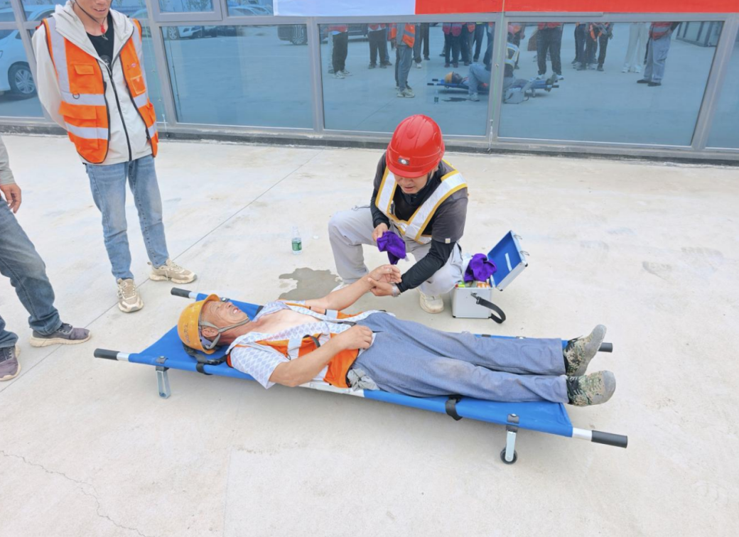 演練模擬了施工現場一名工人在高溫環境下作業時突然中暑暈倒的場景。事發后,現場工友立即向項目管理人員報告,項目應急救援小組迅速響應。救援人員第一時間將中暑工人轉移至陰涼通風處,解開其上衣領口,用濕毛巾冷敷額頭、擦拭身體進行物理降溫,并為其補充淡鹽水。同時,醫療救護組攜帶防暑藥品和急救設備趕赴現場,對中暑工人進行進一步檢查和救治。隨后,模擬120急救車趕到現場,將中暑工人送往醫院進行后續治療。整個演練過程緊張有序,各救援小組分工明確、協同配合,按照預定方案圓滿完成了演練任務。?