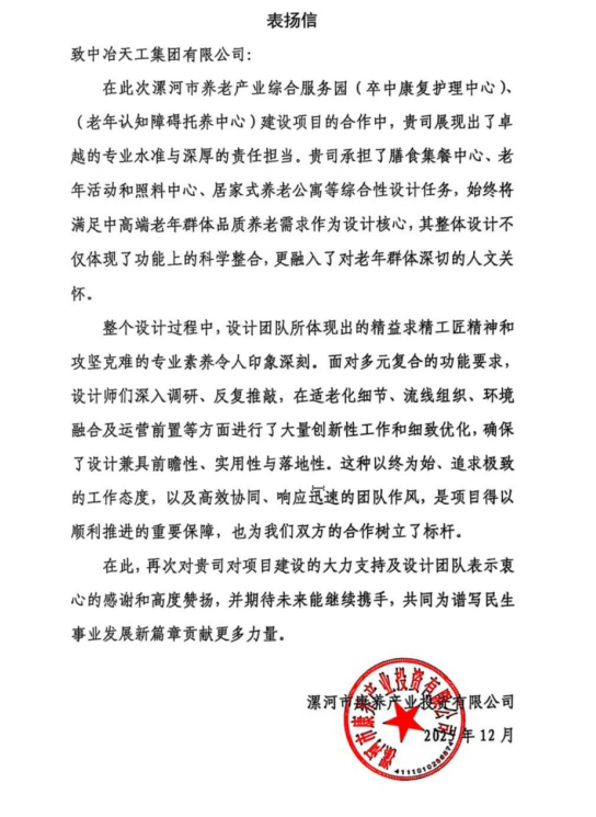 近日,工程技術(shù)總院漯河市養(yǎng)老產(chǎn)業(yè)綜合服務(wù)園設(shè)計(jì)項(xiàng)目(卒中康復(fù)護(hù)理中心、老年認(rèn)知障礙托養(yǎng)中心)收到業(yè)主漯河市康養(yǎng)產(chǎn)業(yè)投資有限公司向中冶天工發(fā)來的表揚(yáng)信。信中,業(yè)主單位對總院設(shè)計(jì)團(tuán)隊(duì)所體現(xiàn)出的精益求精工匠精神和攻堅(jiān)克難的專業(yè)素養(yǎng)給予高度贊許。