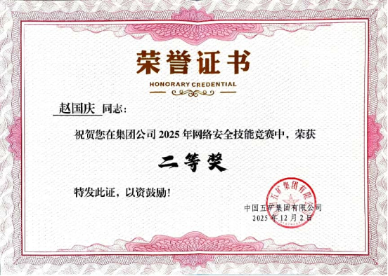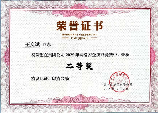 天工由信息化主管王文斌、趙國慶組成參賽隊伍,在高壓賽程中沉著應對,通過漏洞挖掘、系統滲透、網絡流分析等環節,精準識別風險、快速解決問題,最終兩人均以優異成績斬獲兩個二等獎。特別值得關注的是,趙國慶同志憑借優異的理論考核成績,榮膺“網絡安全之星”稱號。天工團隊本次競賽成績在施工類企業中名列前茅。