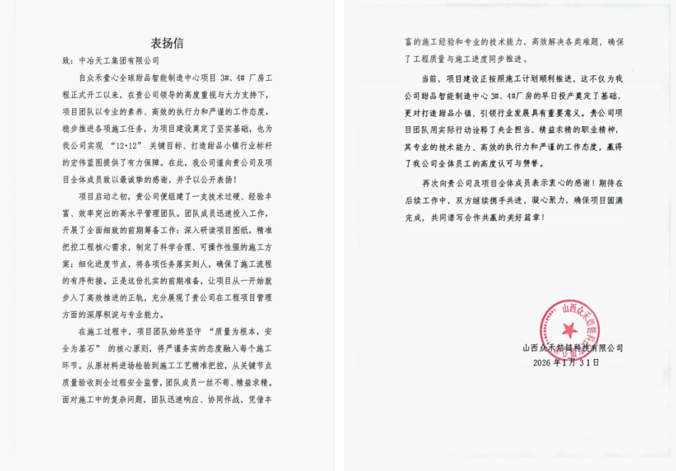 1月31日,中原公司承建的眾禾壹心全球甜品智能制造中心項(xiàng)目收到業(yè)主表?yè)P(yáng)信。信中對(duì)中冶天工各項(xiàng)工作的穩(wěn)步推進(jìn)和項(xiàng)目團(tuán)隊(duì)專業(yè)高效的施工管理與精益求精的建造態(tài)度給予了高度評(píng)價(jià)與充分贊揚(yáng)。