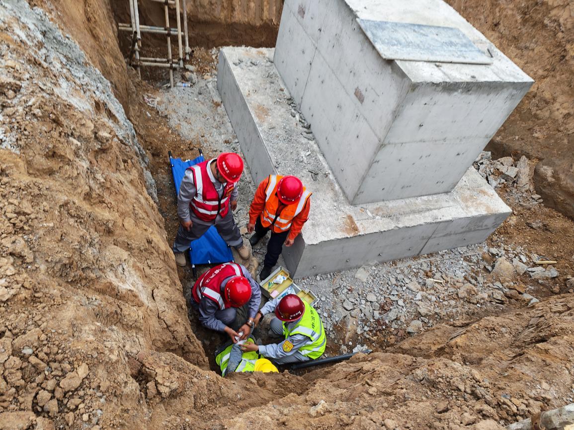 演練緊密結(jié)合項(xiàng)目深基坑施工實(shí)際,模擬基坑邊坡突發(fā)局部坍塌、1名人員被困的緊急場景。事故發(fā)生后,現(xiàn)場安全員第一時(shí)間發(fā)現(xiàn)險(xiǎn)情、發(fā)出警報(bào)并逐級上報(bào),應(yīng)急指揮領(lǐng)導(dǎo)小組迅速啟動(dòng)應(yīng)急預(yù)案。